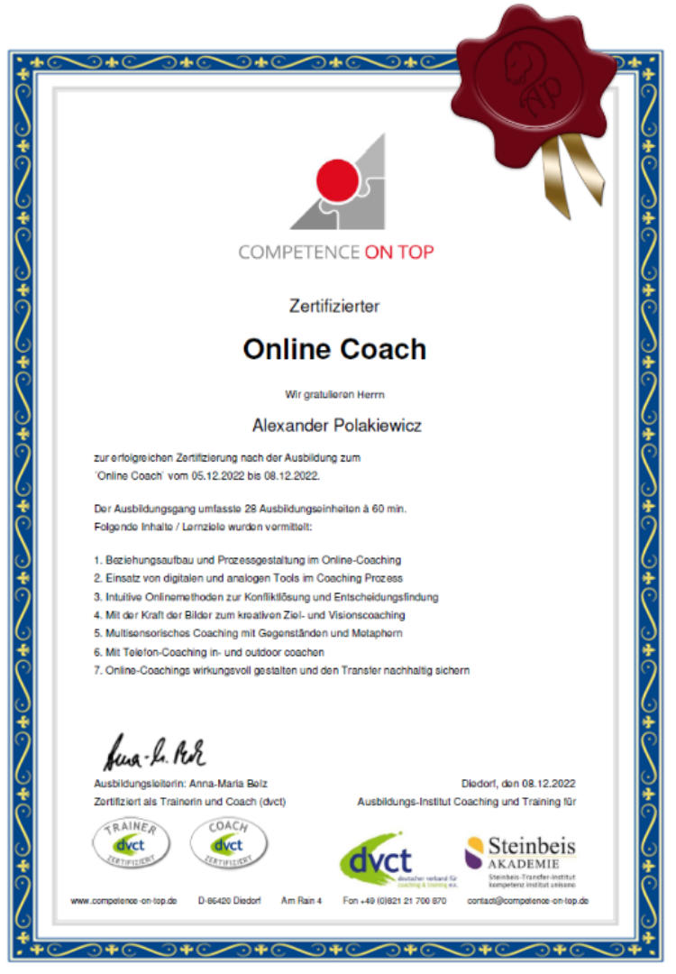 AP-ADVICE Alexander Polakiewicz Kölner Str. 441 51515 Kürten Mobil: +49 (0) I63 I43 84 I7 Mail: info@ap-advice.de USt.-Ident.-Nr.: DE 278 213 177 Gerichtsstand : AG Bergisch Gladbach